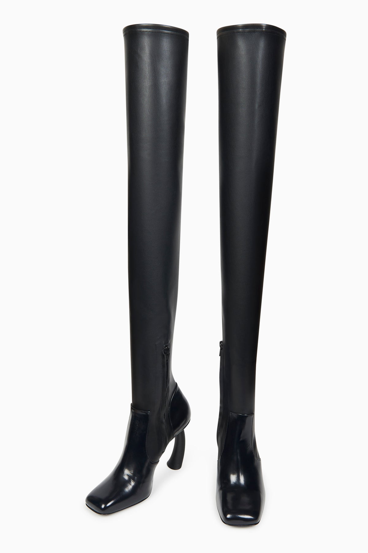 Crafted in Italy, these stretch high boots feature a squared toe and curved heel. Cut from supple black fabric that fits close to the leg, the silhouette extends above the knee for a smooth, elongated line.